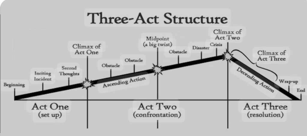 Here’s a story structure from StudioBinder’s article “What is the Three Act Story Structure–and Why it Works” by Alyssa Maio (https://www.studiobinder.com/blog/three-act-structure/):